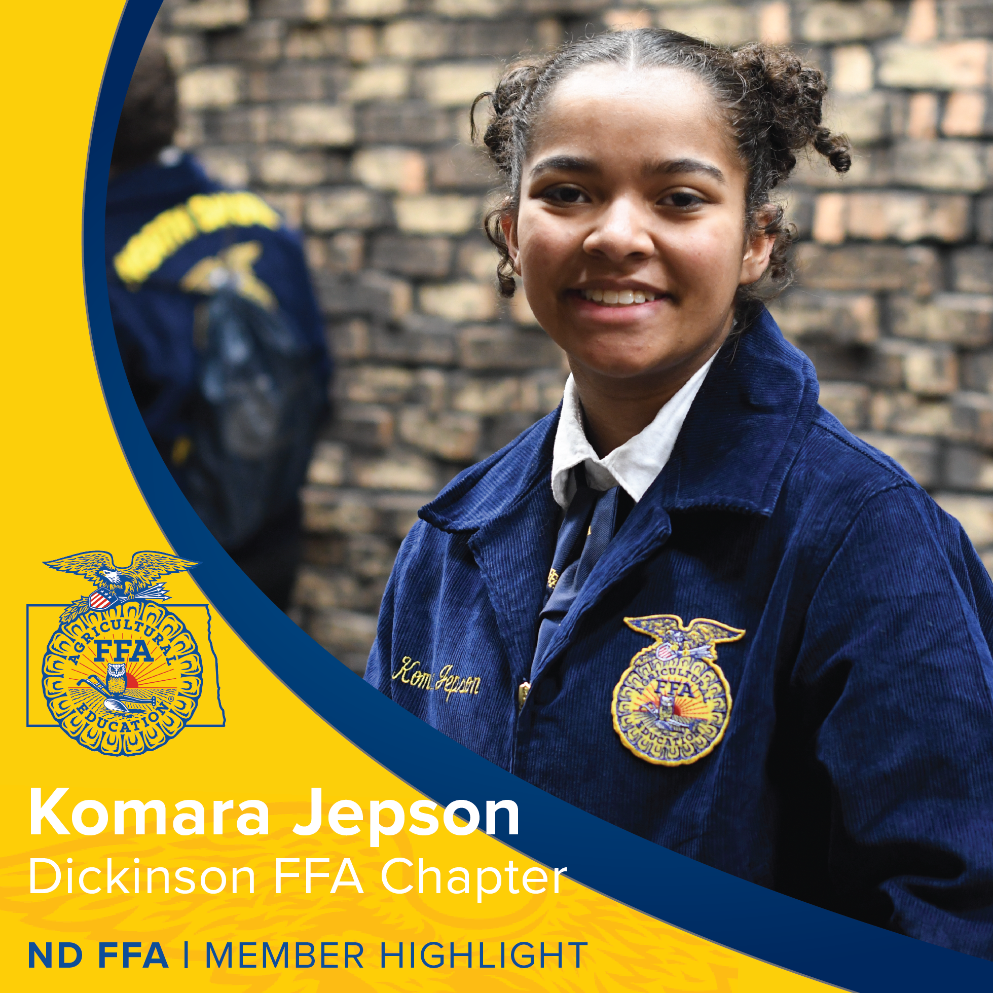 Photo must be of (one) student in an FFA jacket or in street clothes. Please refrain from submitting photos with hand gestures, hats, or distracting backgrounds. A wide-angle photo is preferred. Avoid blurry/ underlit or tightly cropped photos as they do not format well within the ND FFA template.